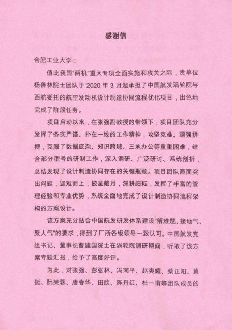 感谢信中说:“值此我国‘两机’重大专项全面实施和攻关之际,贵单位杨善林院士团队于2020年3月起承担了中国航发涡轮院与西航委托的航空发动机设计制造协同流程优化项目。项目启动以来,在张强副教授的带领下,充分发挥了务实严谨、扑在一线的工作精神,攻坚克难、顽强拼搏,克服了数据庞杂、知识跨域、三地办公等重重困难,结合部分型号的研制工作,深入调研、广泛研讨、系统剖析,总结发现了设计制造协同存在的关键瓶颈。项目团队直面突出问题,迎难而上、披星戴月、深耕细耘,发挥了丰富的管理经验和专业优势,系统全面地完成了设计制造协同流程架构的方案设计。该方案充分贴合中国航发研发体系建设‘解难题、接地气、聚人气’的要求,得到了厂所各级领导的一致认可。中国航发党组书记、董事长曹建国院士在涡轮院调研期间,听取了该方案专题汇报,给予了高度好评。”