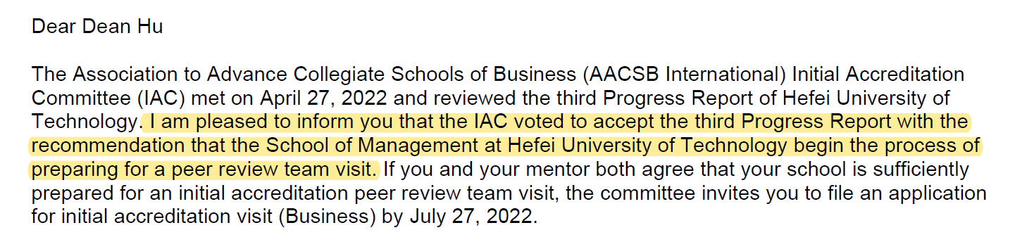 2022年6月10日,接AACSB国际认证首次认证委员会(Initial Accreditation Committees,IAC)官方函件通知,学院于2022年2月15日递交的第三轮进展报告被顺利接收,正式进入AACSB认证最后阶段的自评估报告撰写及现场访视阶段。这是学院在AACSB国际认证工作上取得的重要阶段性成果。