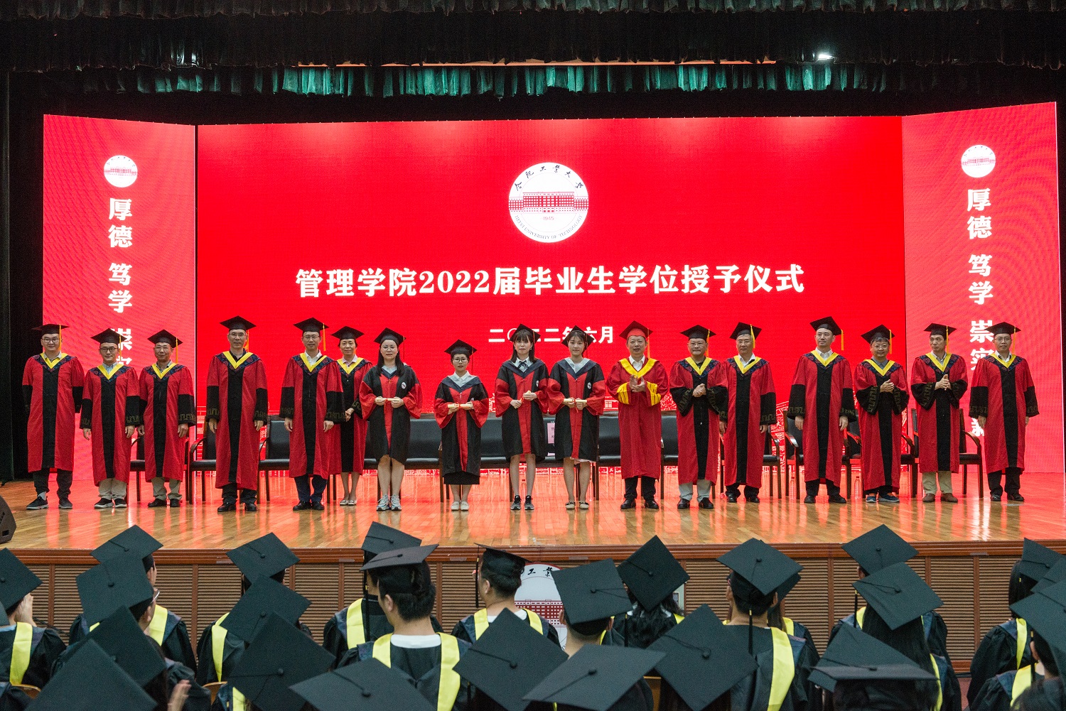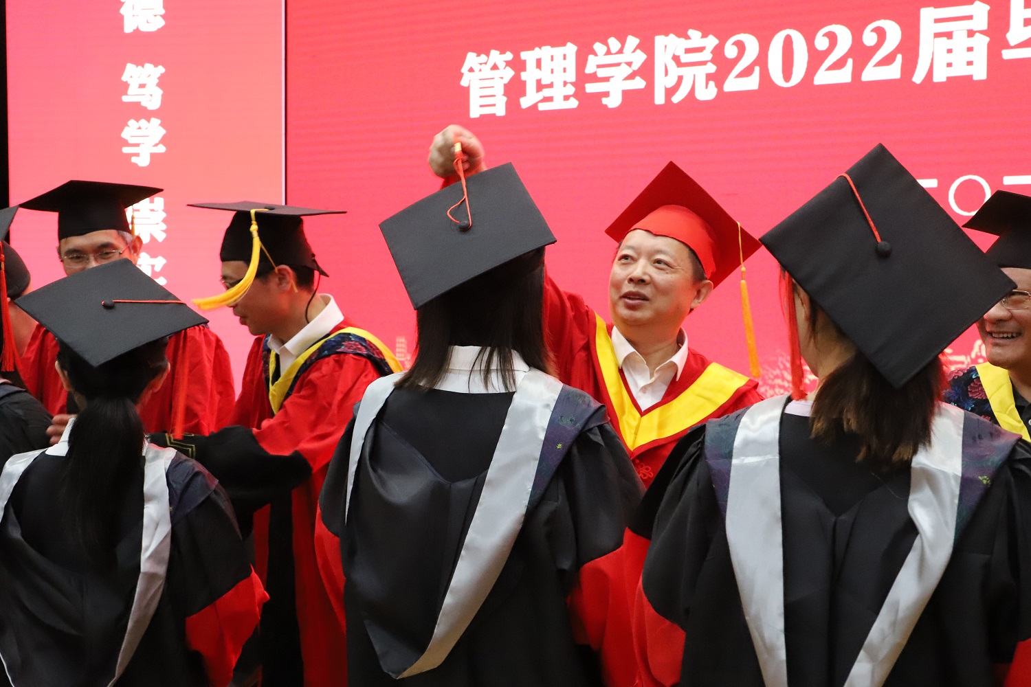 仪式在庄严的国歌声中拉开序幕,院长胡笑旋宣读了《关于授予437ccm必赢国际版2022届毕业生学位的决定》,与会导师为学位获得者颁发学位证书,扶正流苏并合影留念。