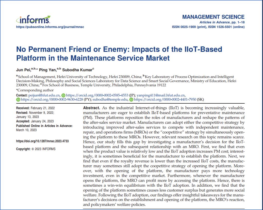 论文详情:Jun Pei, Ping Yan, Subodha Kumar. No Permanent Friend or Enemy: Impacts of the IIoT-based Platform in Maintenance Service Market. Management Science,2023, DOI: 10.1287/mnsc.2023.4733
