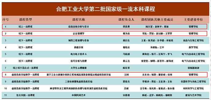 在首批国家级一流本科课程认定中,学院胡笑旋教授团队《管理信息学》获评线上一流课程,梁昌勇教授团队《信息系统分析与设计》获评线下一流课程。截止目前,学院共有5门课程入选国家级一流本科课程。