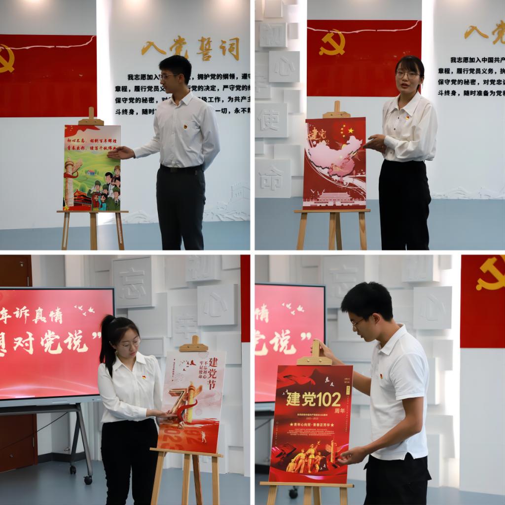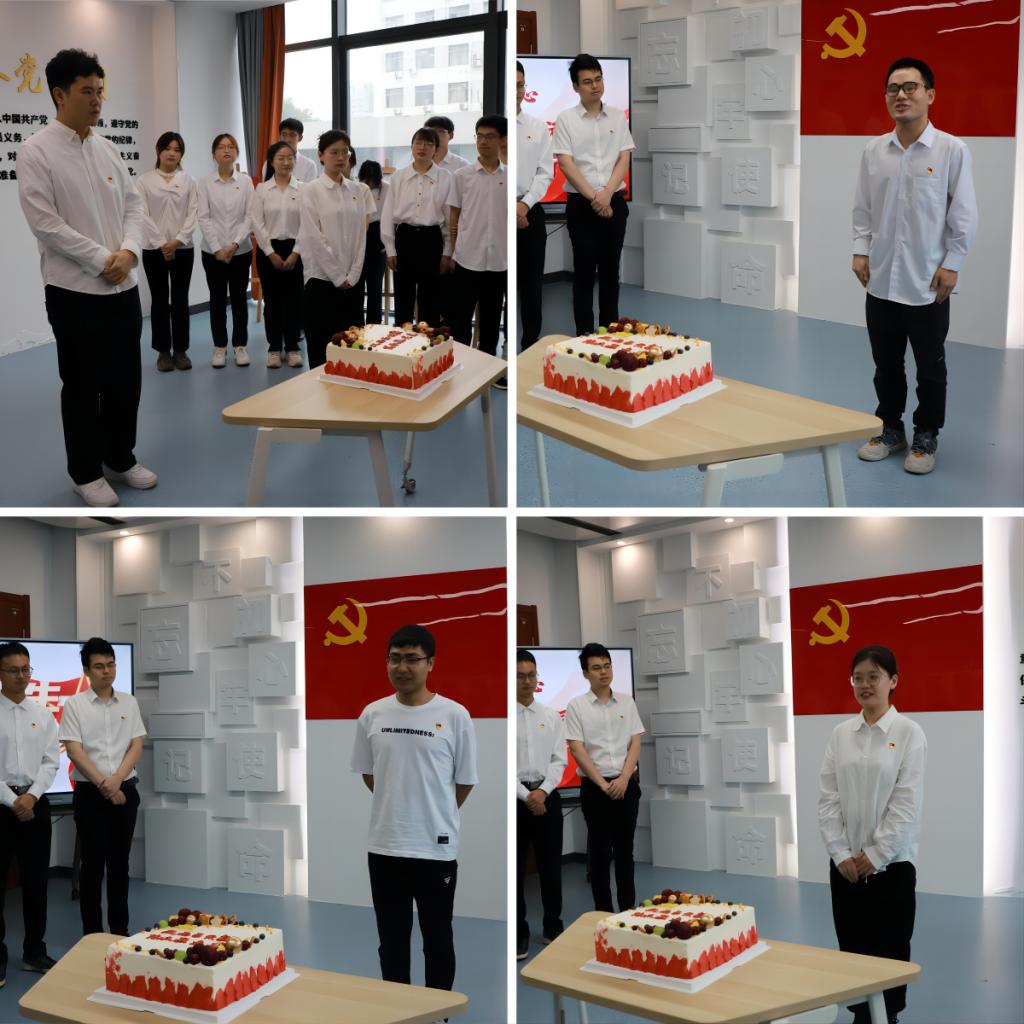活动以“青年诵诗篇”开篇,师生在满怀深情的诗朗诵《江山和文明》中感受诗词字里行间蕴藏在杨善林院士这位老党员心中的情怀与担当。在“青年诉真情”环节,学生党员依次展示围绕红色历程、人物风采、时代新貌等设计的“迎七一”主题海报,对党深情告白,倾诉心中的炙热与坚定。“青年忆初心”环节,学生党员代表领誓,全体党员面对党旗庄严宣誓,再忆入党初心,铭记党员使命。“青年庆华诞”环节,特别邀请7月1日出生的四位学生党员,精心定制专属的生日蛋糕,共同庆祝党的生日,为党送上诚挚的祝福。