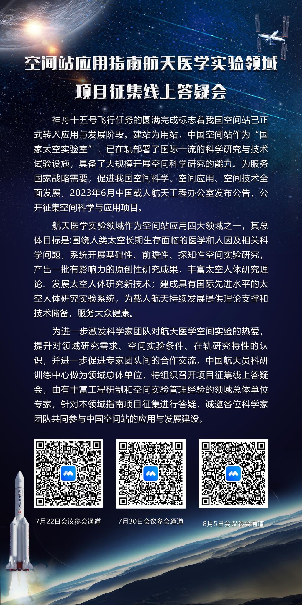 “建站为用站”。作为空间站应用四大领域之一,航天医学实验领域长期围绕人类太空长期生存面临的医学和人因及相关科学问题,系统开展基础性、前瞻性、探知性空间实验研究,以期为载人航天持续发展提供理论支撑和技术储备。为保证本次空间科学与应用项目征集活动的顺利开展,后续中国航天员科研训练中心将召开项目征集线上答疑会,欢迎广大科研人员关注与参与。