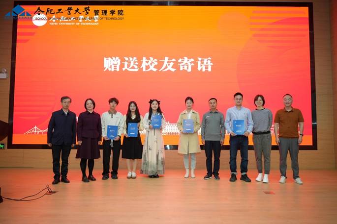 老校友代表夏登梅、马壮、陈钊、李姜、徐启胜向新校友代表赵鑫、吴悠、潘玉、芮千、栗慧宇赠送寄语。寄语学弟学妹们:拥有博大的家国情怀和对人民无限热爱,宽宏的知识结构和强大的学习能力,高远的人生梦想和实现梦想的能力。