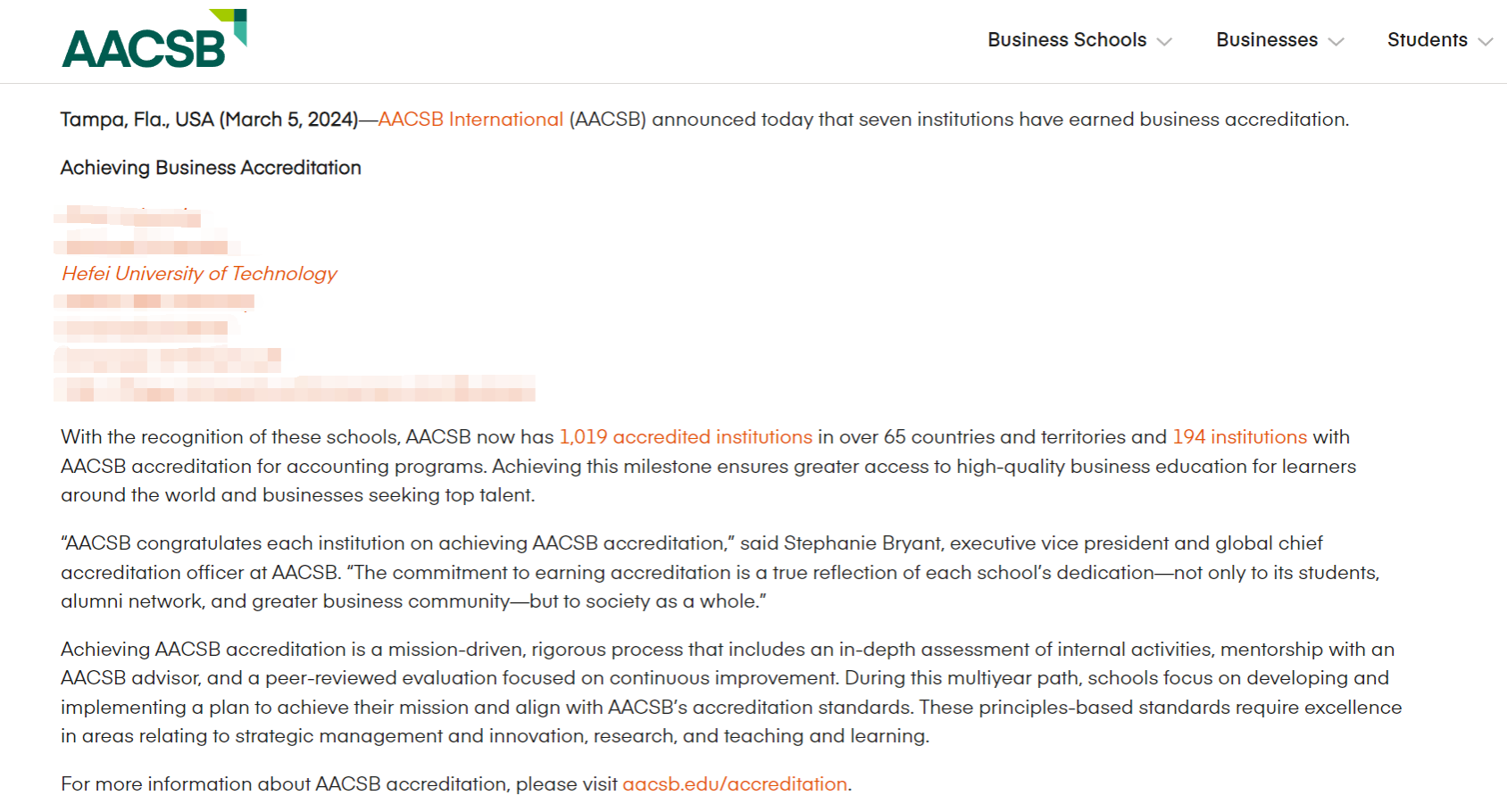3月5日,国际精英商学院协会(The Association to Advance Collegiate Schools of Business,简称AACSB)发布官方公告,437ccm必赢国际版通过AACSB商科教育认证。