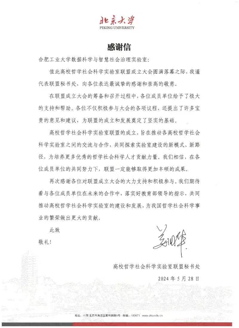 会后,北京大学姜国华副书记代表联盟秘书处给我校数据科学与智慧社会治理实验室发来感谢信,并表示要与各成员单位一起落实好教育部领导的指示,共同推动高校哲学社会科学实验室的建设和发展。联盟成员高校将紧跟国家战略需求,携手推动自然科学和社会科学的交叉渗透和融合创新,加快促进数智化时代的人文社会科学研究范式转变,为中国哲学社会科学的高质量发展贡献智慧和力量,高效赋能中国自主体系知识建构。