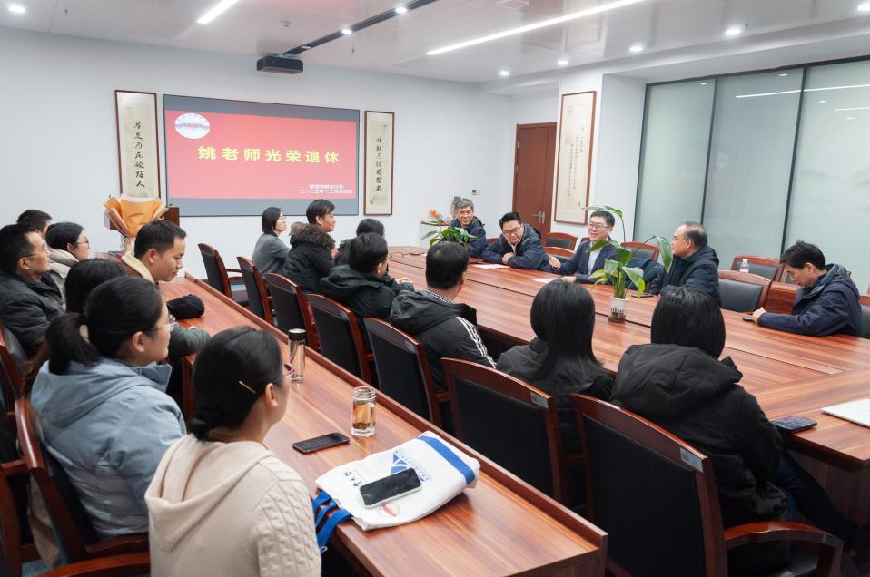 2025年12月24日下午,会计系党支部组织召开了姚禄仕教授荣休会,进行了一场特殊的思想交流。学院党委书记张强、副院长李霄剑出席,会计系教师齐聚一堂,共同表达对姚老师的崇高敬意与美好祝愿。荣休仪式上,通过视频回顾、同事分享以及姚老师的深情回顾与嘱托,全面呈现了一名老党员四十载从教经历中永葆党员政治本色,为学院会计专业学科高质量发展无私奉献的动人事迹。