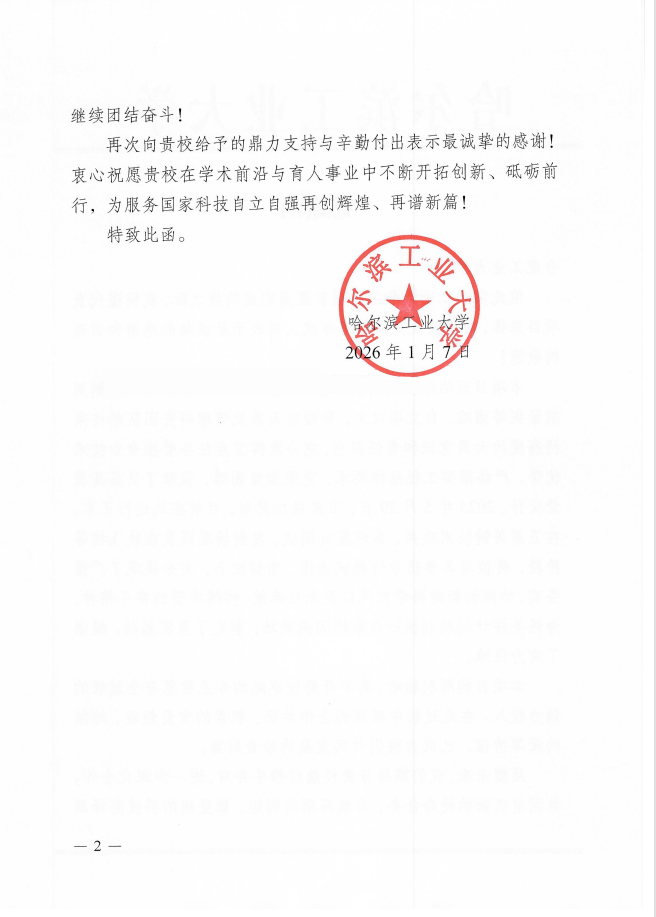 哈尔滨工业大学在感谢函中表示,项目的顺利验收离不开学校鼎力支持,并期待与学校继续深化合作,共同肩负新的使命任务,为续写新的辉煌、攀登新的科技高峰而继续团结奋斗,并祝愿学校在学术前沿与育人事业中不断开拓创新,为服务国家科技自立自强再谱新篇。