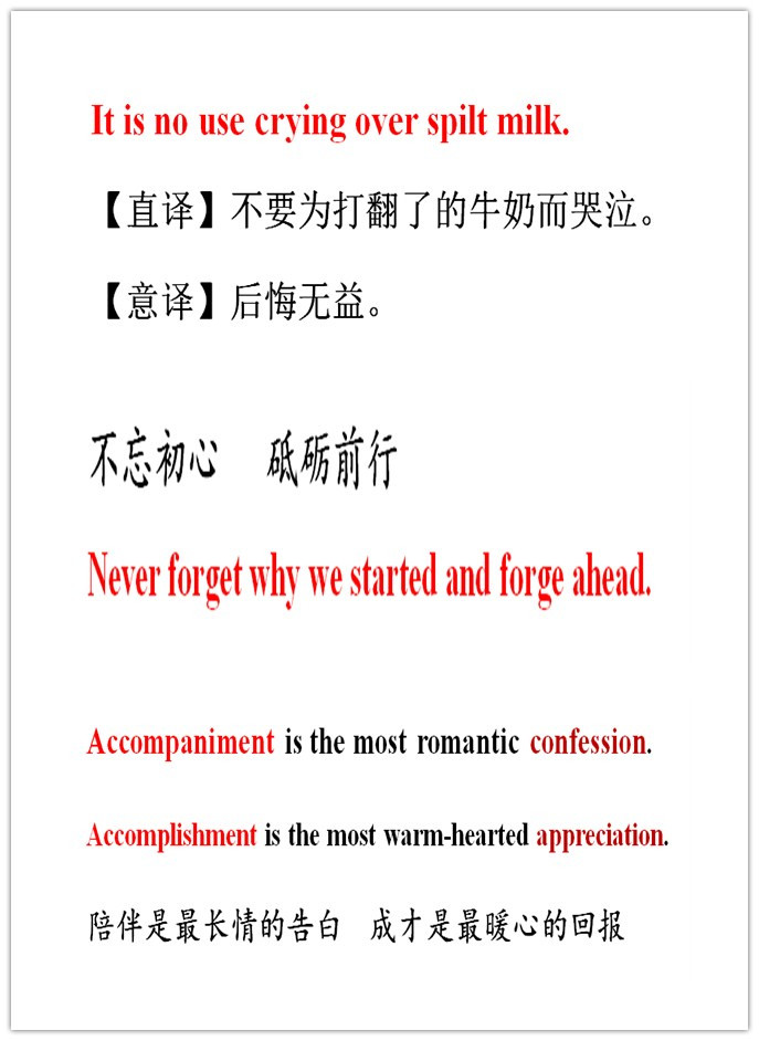 (1) 这句话可以直译为“牛奶打翻了,哭也没用”;也可意译为“覆水难收;后悔无益”。“直译”和“意译”是翻译的两种方法,“直译”可以保持原作的丰姿和风格,有助于读者深入了解源语所包含的意象;“意译”更接近目标语读者的阅读偏好。究竟是直译好还是意译妙?陆殿杨先生提出了一条原则:“Translate literally, if possible, or appear to free translation. (能直译就尽量直译,不能直译就采取意译)”。