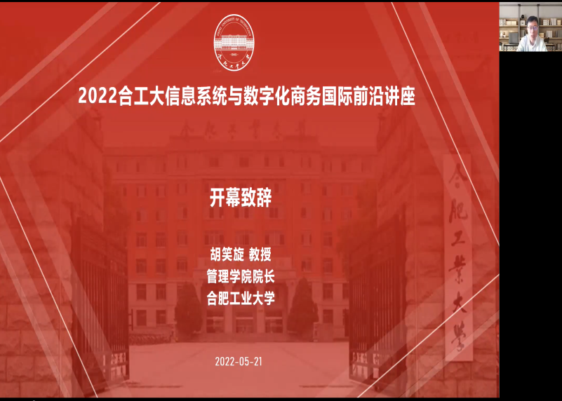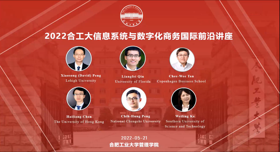 2022521日,第一届bwin必赢线路检测信息系统与数字化商务国际前沿讲座成功举办。本次会议邀请了6位信息系统与数字化商务领域国际知名学者,包括美国理海大学的彭小松教授、弗罗里达大学的邱凉飞副教授、哥本哈根商学院的陈致玮教授、香港大学的陈海亮副教授、台湾政治大学的彭志宏副教授以及南方科技大学的柯玮玲教授,分享他们的前沿研究,共同讨论本领域的最新机遇与未来发展。他们中多位担任UTD期刊Journal of Operations Management的部门主编(Department Editor)、MIS Quarterly的高级主编(Senior Editor)、Production and Operations Management的高级主编(Senior Editor)以及MIS Quarterly的副主编(Associate Editor)等。本次会议由437ccm必赢国际版魏少波教授组织和主持,437ccm必赢国际版主办。会议特邀杨善林院士、胡笑旋院长致辞。考虑到疫情防控的要求,本次会议采用线上会议形式举办。