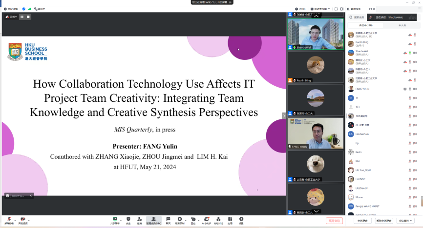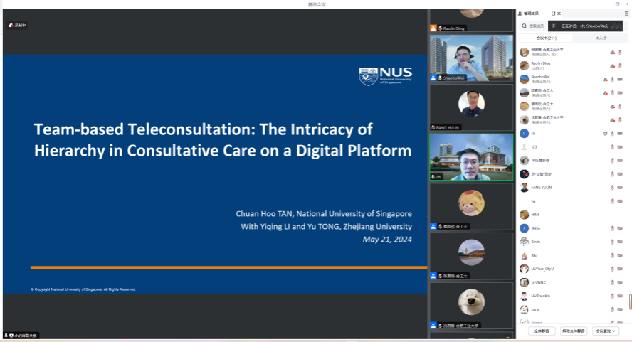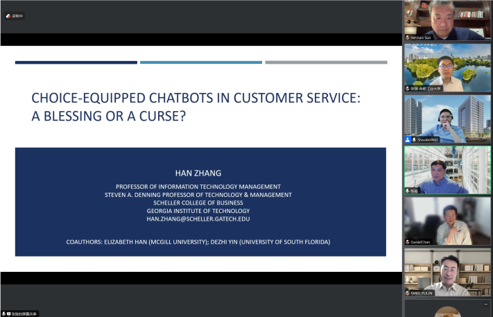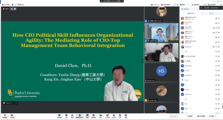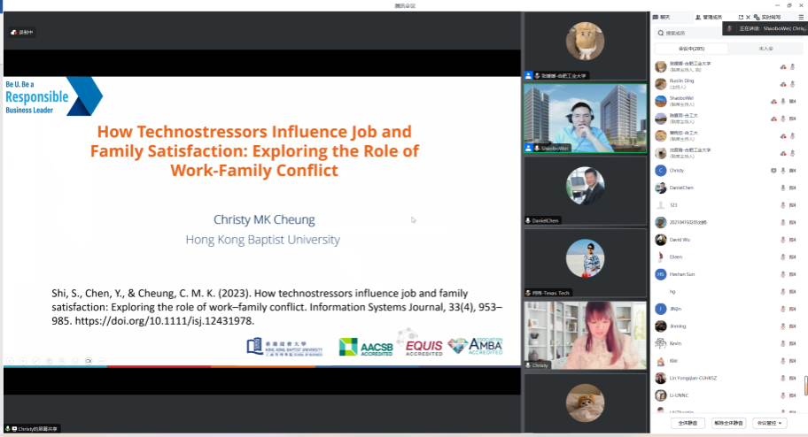 与会学者分别就客户服务聊天机器人提供备选答案何时以及为何会增强或损害客户的服务体验、使用生成式AI对创意的两面性影响、CIO政治技能如何影响组织的敏捷性、技术压力源如何影响员工的工作和家庭满意度、团队协作技术的使用如何影响IT项目团队的创造力以及数字平台上团队会诊中错综复杂的等级制度如何影响团队医生的会诊意见等信息系统与数字商务领域前沿研究主题进行分享,并与参会学者就感兴趣的问题进行了深入交流与讨论。