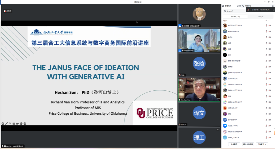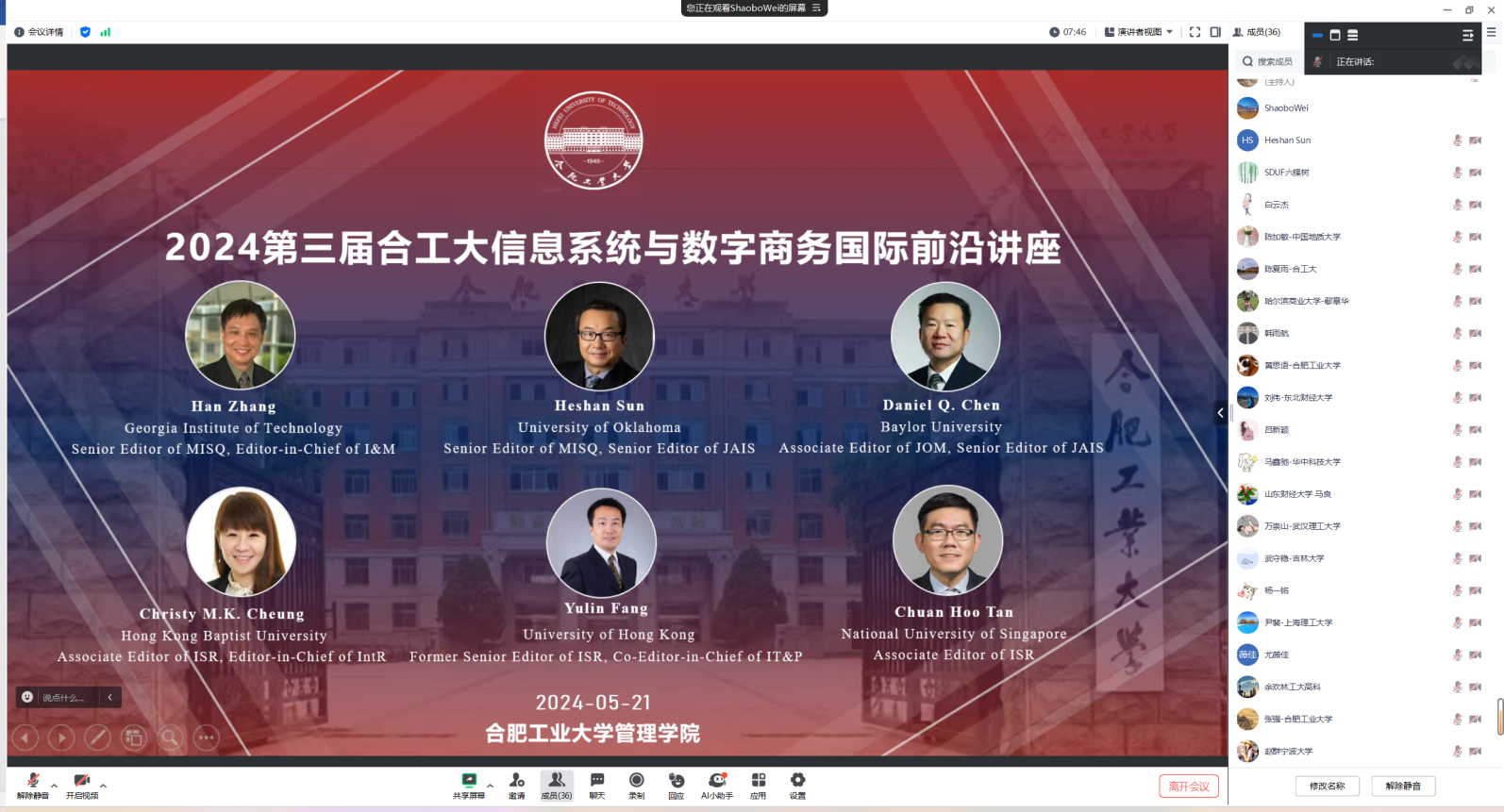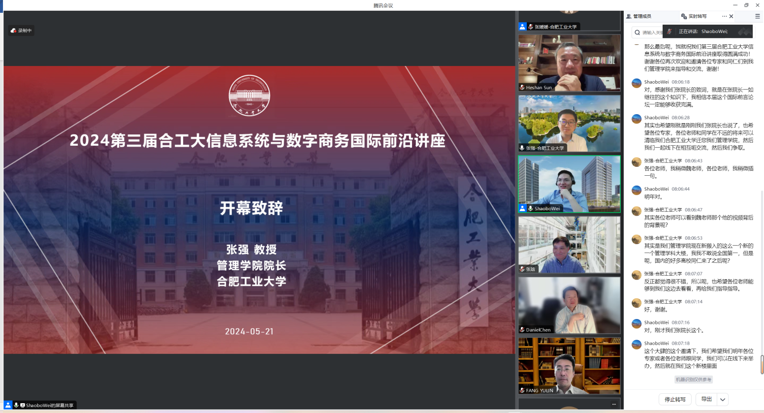 2024年5月21日,第三届bwin必赢线路检测信息系统与数字商务国际前沿讲座成功举办。本次会议邀请了6位信息系统与数字商务领域国际知名学者,包括美国佐治亚理工学院的Han Zhang(张晗)教授、美国俄克拉荷马大学的Heshan Sun(孙河山)教授、美国贝勒大学的Daniel Q. Chen教授、香港浸会大学的Christy M. K. Cheung教授、香港大学的Yulin Fang(方钰麟)教授以及新加坡国立大学的Chuan Hoo Tan副教授,分享他们的前沿研究,共同讨论本领域的最新机遇与未来发展。本次会议邀请的专家学者均担任或曾担任UTD期刊MIS Quarterly的高级主编(Senior Editor)、Information System Research的高级主编(Senior Editor)、Journal of Operations Management的副主编(Associate Editor)以及Information System Research的副主编(Associate Editor)等。本次会议由437ccm必赢国际版和管理科学与工程学科“未来科学家”研究生国际学术论坛联合主办。会议由437ccm必赢国际版魏少波教授组织和主持,张强院长在会议开幕式致辞。