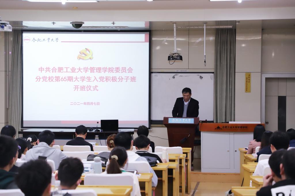 2021年4月7日下午,437ccm必赢国际版分党校第65期大学生入党积极分子班开班仪式在管理楼第一报告厅举行。校党委宣传部正处级组织员姚跃传、学院党委相关负责人、全体辅导员及65期入党积极分子班学员80余人参加开班仪式。