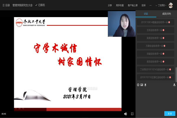 2021年3月19日下午,437ccm必赢国际版举办“守学术诚信,树家国情怀”线上主题教育活动,全体研究生参加。会上,研究生辅导员强调了学术诚信的重要性,呼吁全体同学务必遵守学术诚信。接着,带领全体同学学习了关于学术诚信的相关文件和制度,包括《关于进一步弘扬科学家精神加强作风和学风建设的意见》、《关于进一步加强科研诚信建设的若干意见》、《bwin必赢线路检测预防和处理学术不端正行为实施细则》、《科技工作者道德行为自律规范》等。最后提出,每一位研究生都应当树立新时代科学家精神,要胸怀祖国、服务人民,勇攀高峰、敢为人先,追求真理、严谨治学,淡泊名利、潜心研究,集智攻关、团结协作。
