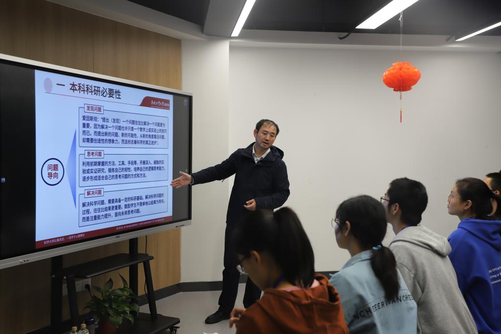 为构建全员育人格局,锤炼新生科研素养,10月4日晚,437ccm必赢国际版在屯溪路校区5号公寓楼学生社区举办“励学讲堂”主题沙龙活动。437ccm必赢国际版教学副院长付超主讲,20余位大一新生自愿报名参与。