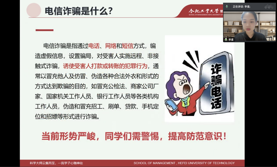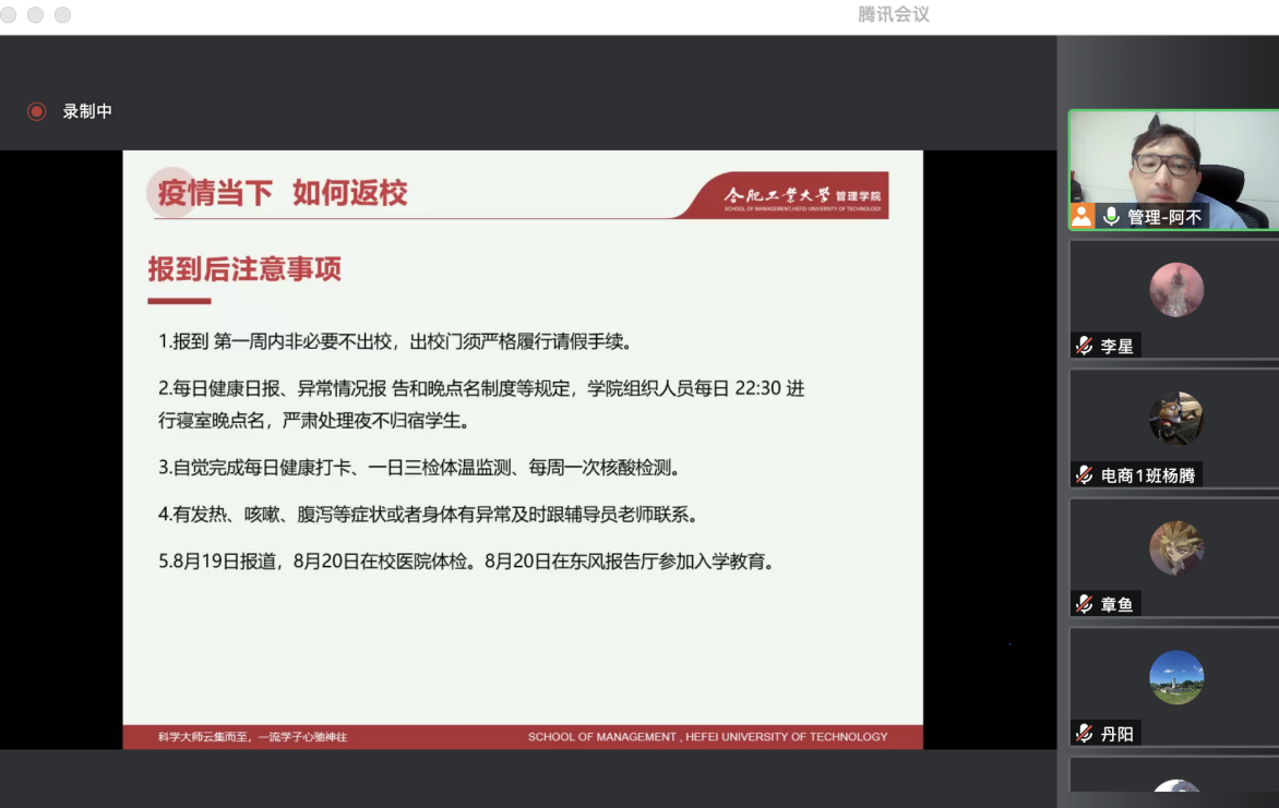 班会上,辅导员带领新生们线上参观“VR校史馆”、浏览校园地图,帮助大家快速了解工大校史校情,尽快熟悉校园环境。随后,阿不老师详细解读了新生报到流程、疫情防控规定,提醒大家及时参加核酸检测、提前规划返校行程、做好个人安全防护。接着,他以“爱心助力梦想,梦想助你飞翔”为题,为学生们讲解了bwin必赢线路检测本科学生资助政策体系,重点阐释了国家助学贷款、新生入学资助项目、绿色通道、困难补助、勤工助学等政策要求。李星老师为学生们梳理了军训准备事宜,并紧紧围绕“谨防电信诈骗,共筑校园安全”,详细讲述了常见的电信诈骗类型及特点,通过案例分析引导学生掌握电信诈骗防范方法,提醒学生们下载“国家反诈中心”APP,牢记“96110”全国反诈电话,增强安全防范意识。最后,两位老师向学生们征集“新生回信”,激励学生珍惜青春时光,保持身心健康,规划四年发展,志存高远,脚踏实地,努力在青春的赛道上跑出当代青年的最好成绩。