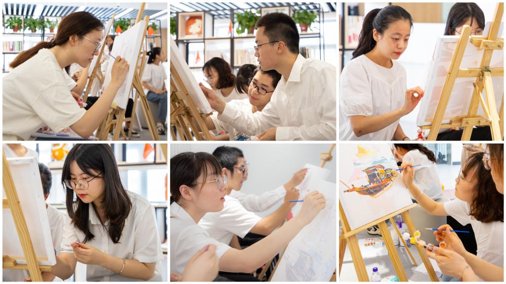 参加活动的学生们选取画板,积极投入,用笔触描绘祖国山河元素,用色彩表达心中爱与信念,在“五星红旗”“美丽中国”“相亲相爱”等音乐背景下,绘制出一幅幅兼具红色底蕴和观赏性强的艺术作品。“如果信念有颜色,那一定是中国红!”最后,学生们纷纷畅谈活动心得,郭凡嘉同学谈到“我的作品名为‘红色激情’,由六位青春热血、激情澎湃的青年人组成,他们在红色大地上跳跃、奔跑,表达了当代中国青年对美好理想的追求,以及脚踏实地,不断奋斗的青年品格。”吕世安同学的作品名为“不忘初心”,他说,“我的作品虽然只有红色和白色两种颜色,但是在一笔笔描绘中始终提醒自己初心之重,定会在百尺竿头更进一步的信念中,踔厉奋发、继续前行,书写属于我们青年一代的画卷。”