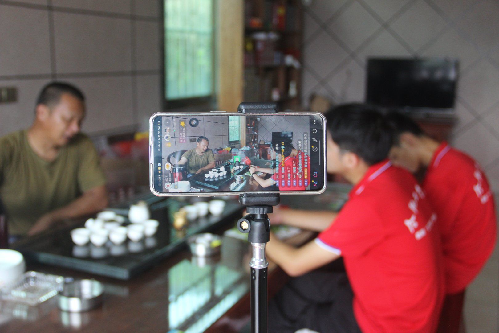 “直播推广茶文化,云游生态军营乡。”根据前期实地走访,团队了解了军营村实地产业情况,并策划了“生态军营,云游茶乡”茶文化线上旅游体验直播。队员们跟随军营村制茶村民前往当地茶园开展采茶、制茶活动,在师傅的带领下前往当地茶园采摘茶叶,领略壮美云雾梯田,并在茶工坊亲身体验了制茶的萎凋、发酵、杀青、翻炒、揉捻和干燥过程。此次采茶、制茶活动全程在抖音平台网络直播,点赞量一度破万。以云直播用镜头向全国各地的观众们展示了军营村的高山茶业,传播茶文化,为高山产业宣传开拓了新思路。