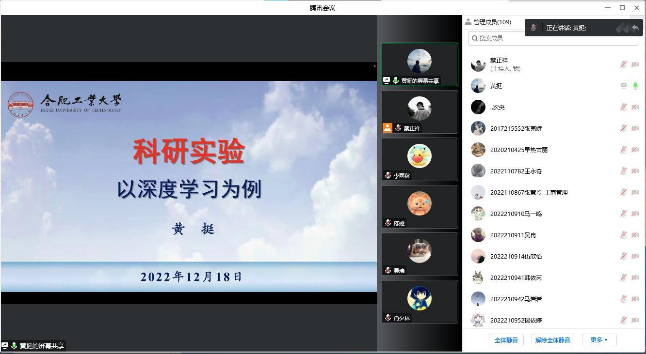肖夕林分享了他在科研学习中取得的成绩,鼓励大家读博期间的科学研究一定要面向国家重大需求,把论文写在祖国的大地上,勠力解决“卡脖子”难点和难题。同时,他还结合自己遇到的各种挫折,勉励同学们时刻保持乐观、坚毅的人生态度。黄挺以“科研实验——以深度学习为例”为主题,就编程语言准备、理论方法基础、科研试验开展三个部分展开论述,鼓励同学们在当前人工智能时代,要不断提高编程能力,早准备早规划早学习,以便后期根据参与项目的应用范围选择合适的编程语言进行开发,顺利推进研究生期间的各项工作。
