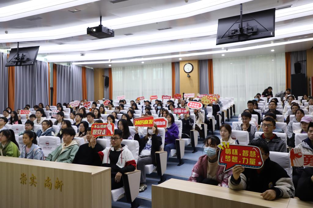 宣讲团成员李星、胡兴隆、董磊分别作了题为《回望历史问初心,千秋伟业谁抗鼎》、《青春——从党的二十大谈谈中国的未来规划》、《以中国式现代化“点亮万家灯火”》的分享,从不同角度生动详实地解读了党的二十大报告的精神实质与丰富内涵,希望同学们以崭新的精神风貌和学习状态拥抱新时代,践行新思想,实现新作为,立志做有理想、敢担当、能吃苦、肯奋斗的新时代好青年。