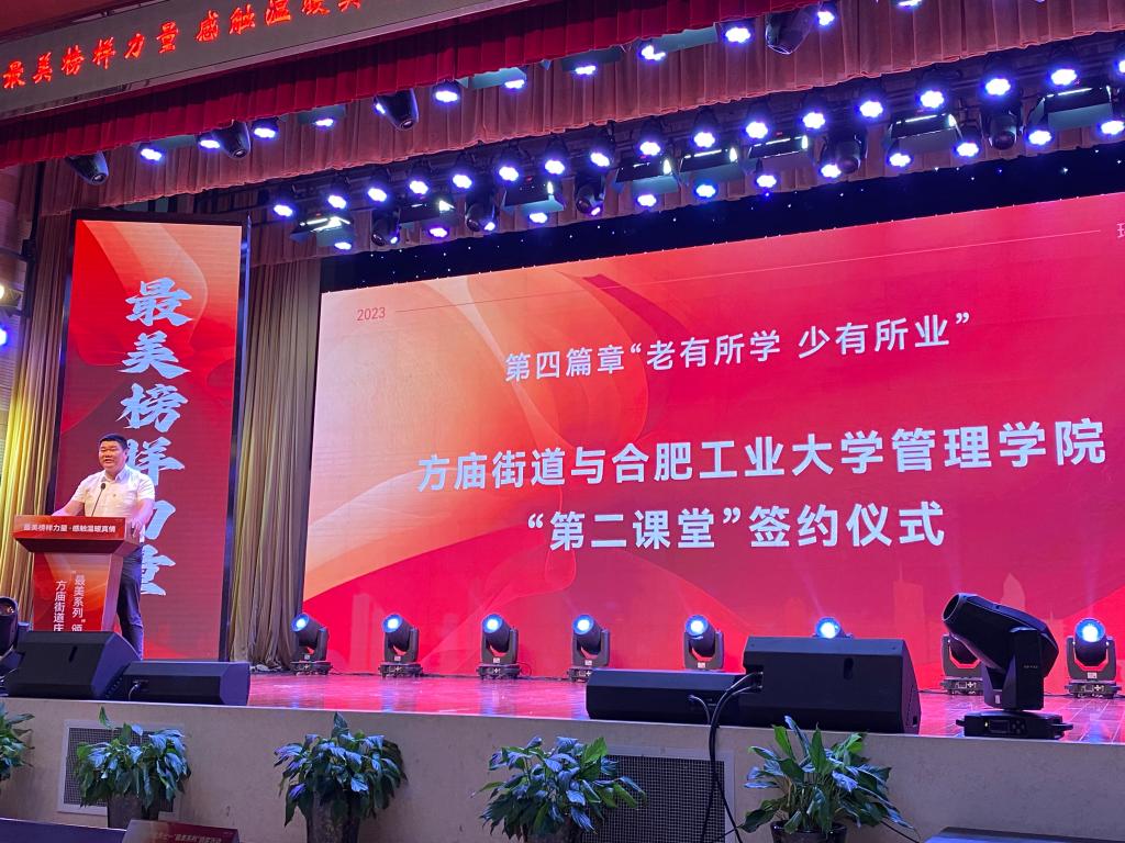 6月27日下午,管理学院与瑶海区方庙街道共建“第二课堂”教育实践示范基地签约揭牌仪式在合肥少儿艺术学校当涂路校区大礼堂举行。瑶海区委组织部、区委老干部局、区人力资源和社会保障局、方庙街道党群工作部、党群服务中心、社会事务部、社区建设部、工会、妇联、团工委相关负责人和合工大学生代表、社区志愿者代表等共计百余人参加。