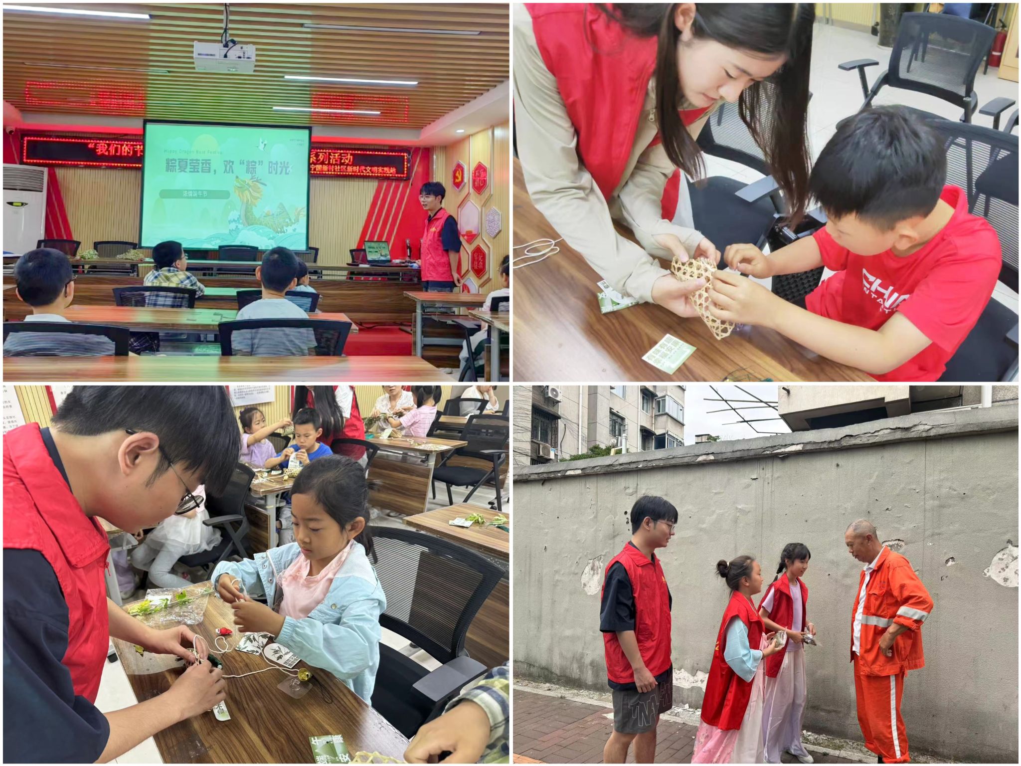 活动中,志愿者夏永正同学首先以PPT的形式分别介绍了端午节的起源;随后,介绍端午节的风俗,如划龙舟、吃粽子、画额、挂香包以及悬艾草,带领小朋友们充分了解我国端午节的传统习俗;接下来,志愿者与小朋友们一起学习端午节相关诗词,感受中华民族传统节日的独特魅力;最后进入游戏环节,首先以“语‘粽’心长”为主题的你画我猜小游戏,小朋友们积极参与。随后,志愿者们和小朋友们一起制作端午挂件,让孩子们从手工制作中获得快乐体验,从体验中感悟传统文化。活动结束后,研究生志愿者和小朋友们一同去社区周围给环卫工人等辛勤劳作的工作者送去了粽子,提前送去端午节祝福。