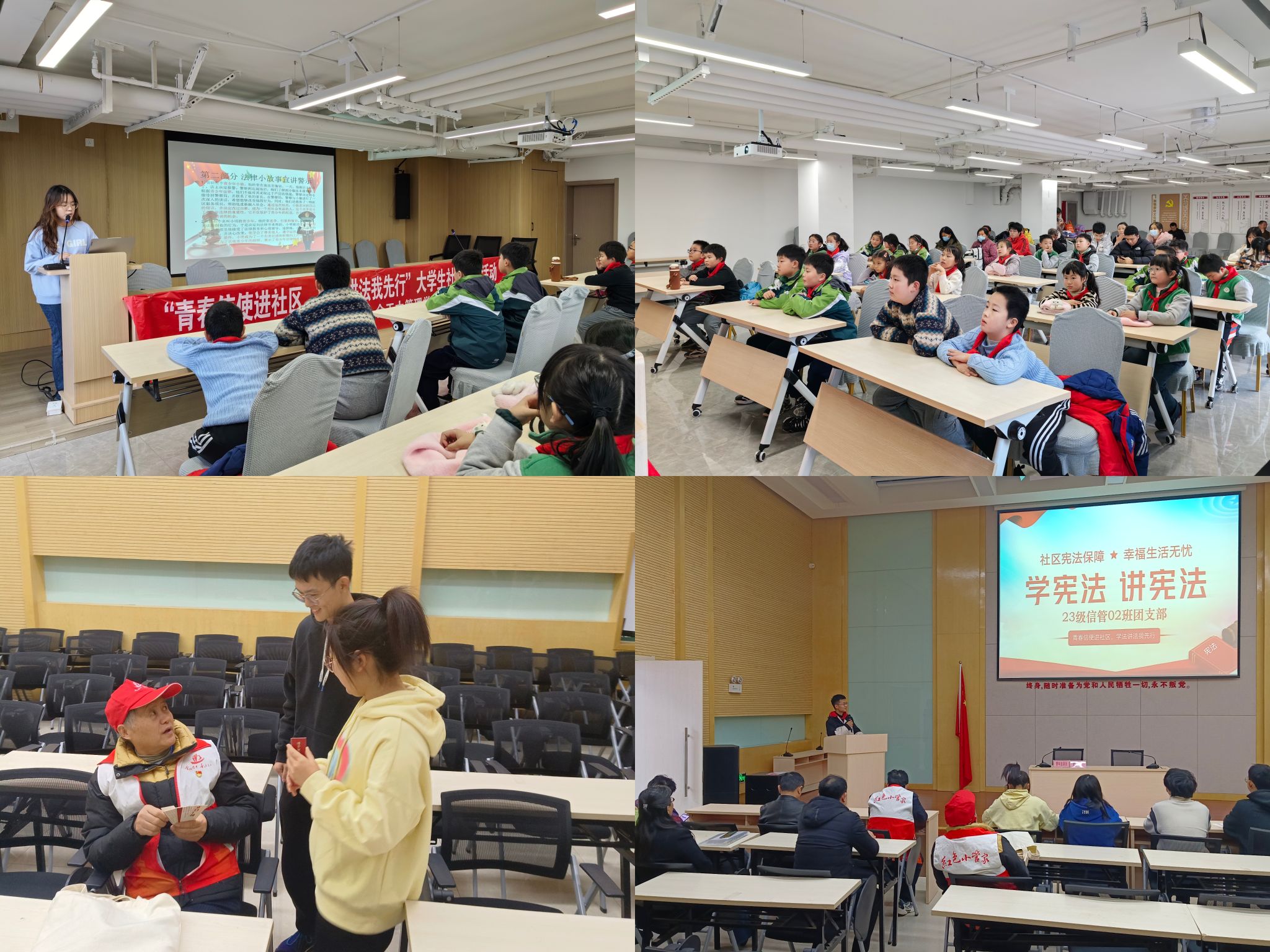 其中,电子商务2023级1班团支部前往军区社区,带领小朋友们进行宪法晨读、了解法律小故事、学习《宪法伴我们成长》歌曲、体验“看图学法”、举办禁毒知识小竞赛,为小朋友们展开别开生面的一堂普法宣传小课堂。工商管理类2023级4班团支部来到美湖社区,以“宪法与公民的联系”为主题与美湖小区的居民们一起走进宪法、了解宪法,宣讲以公民的社会保障与福利、工作条件与劳动保护等热点问题切入,详细讲解了宪法下公民的基本权益,并运用例子向大家展示了如何在日常生活中运用这些权利与该怎样处理危害了我们权益的事件,居民们反响热烈。信息管理与信息系统2023级2班团支部前往包公社区龙图剧场,针对与老年人息息相关的《道路交通安全法》、保健品诈骗、封建迷信诈骗、抛物诈骗等社会现象,为老年人普及了法律常识,同时又将宪法晨读、《宪法伴我们成长》歌曲等内容传播到社区居民当中。