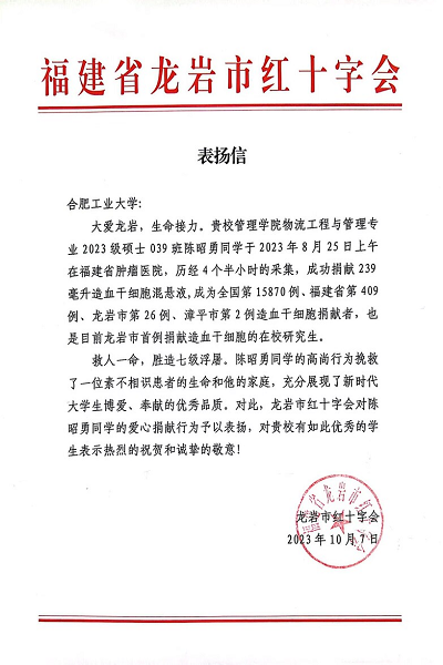 近日,437ccm必赢国际版收到一封龙岩市红十字会写给我校的表扬信,反映2023级物流工程与管理专业的硕士学生陈昭勇,于8月25日上午在福建省肿瘤医院,历经4个半小时的采集,成功捐献239毫升造血干细胞混悬液。