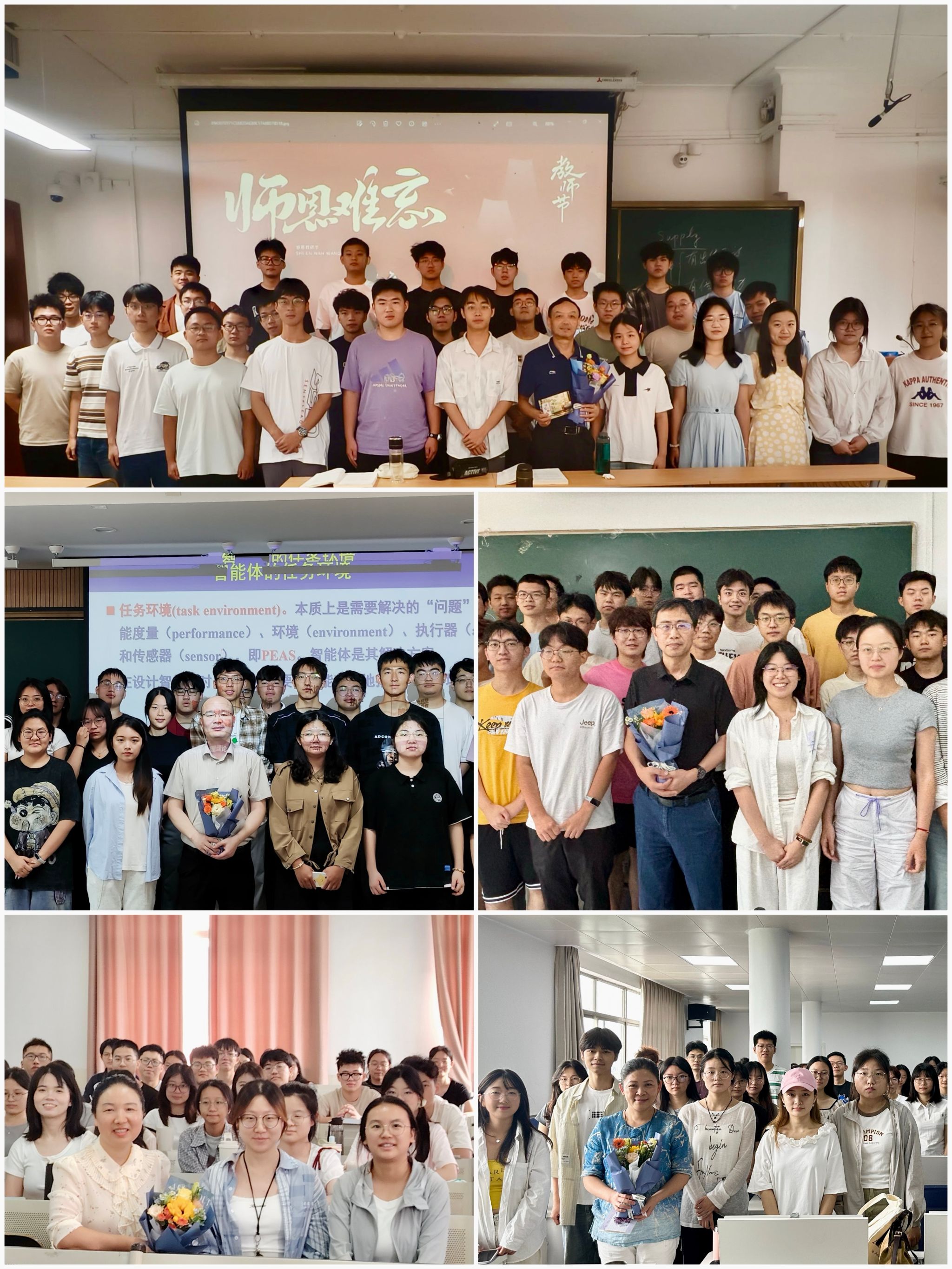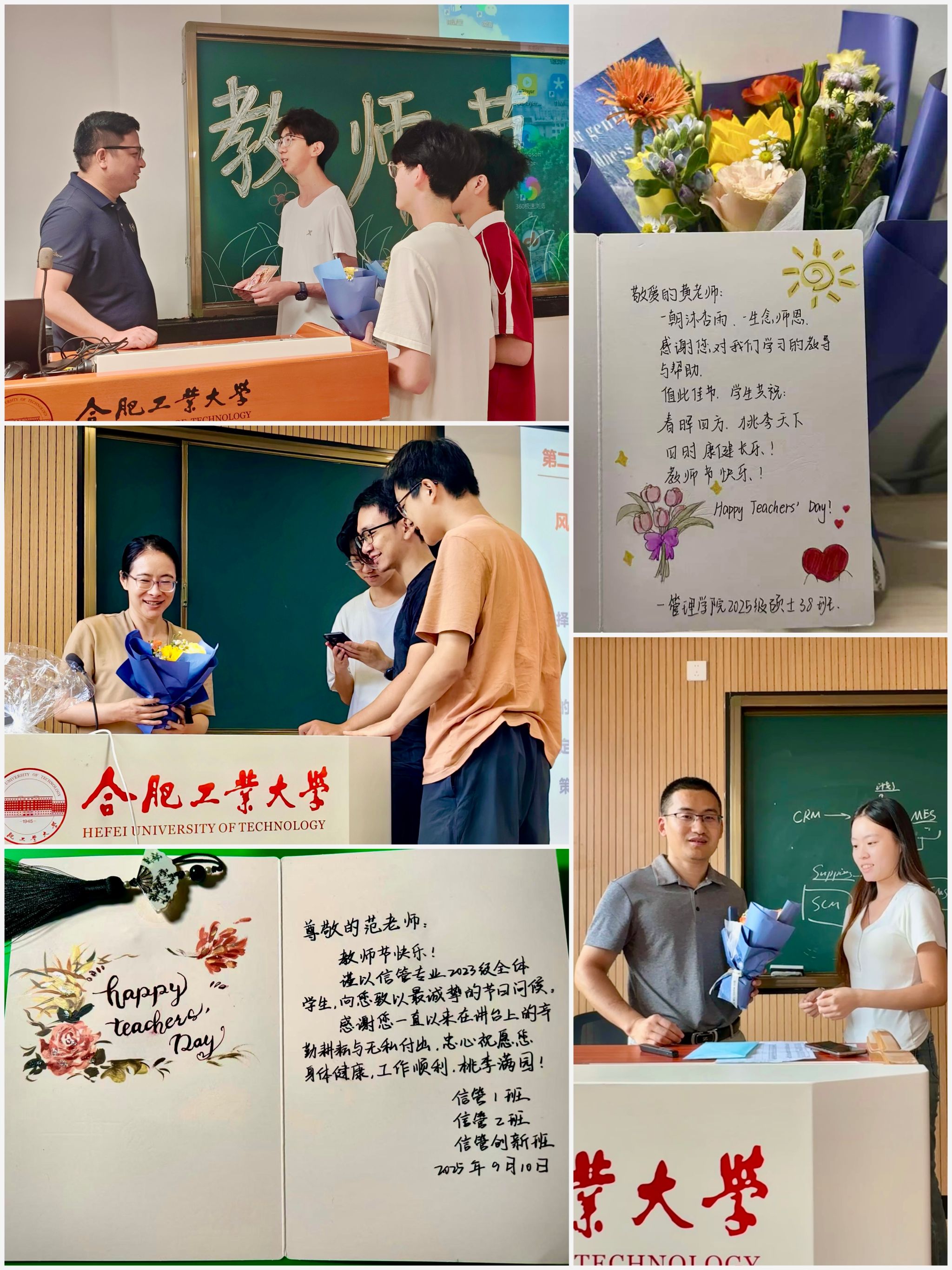 活动前期,学院指导班级骨干精心书写祝福卡片,暖心设计班级专属特色活动,引导学生珍惜校园时光,感恩老师的谆谆教诲与温暖陪伴。活动当天,各年级学生代表手捧花束、怀揣贺卡,向任课教师逐一送上祝福,一句句“老师您辛苦了”“祝您节日快乐”,让敬意在面对面的交流中自然流淌。此外,不同年级还打造了专属感恩场景:2024级本科生精心设计教师节主题电脑壁纸,课前提前投放在教室白色幕布上,让教师走进课堂便感受满屏暖意;2023级本科生以合唱《听我说谢谢你》为礼,悠扬歌声里满含对教师辛勤付出的感恩;2025级研究生集体诵读祝福语,现场掌声与欢呼声不断。