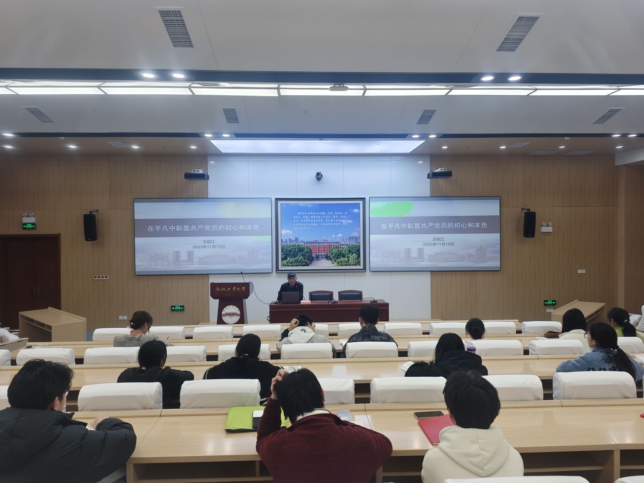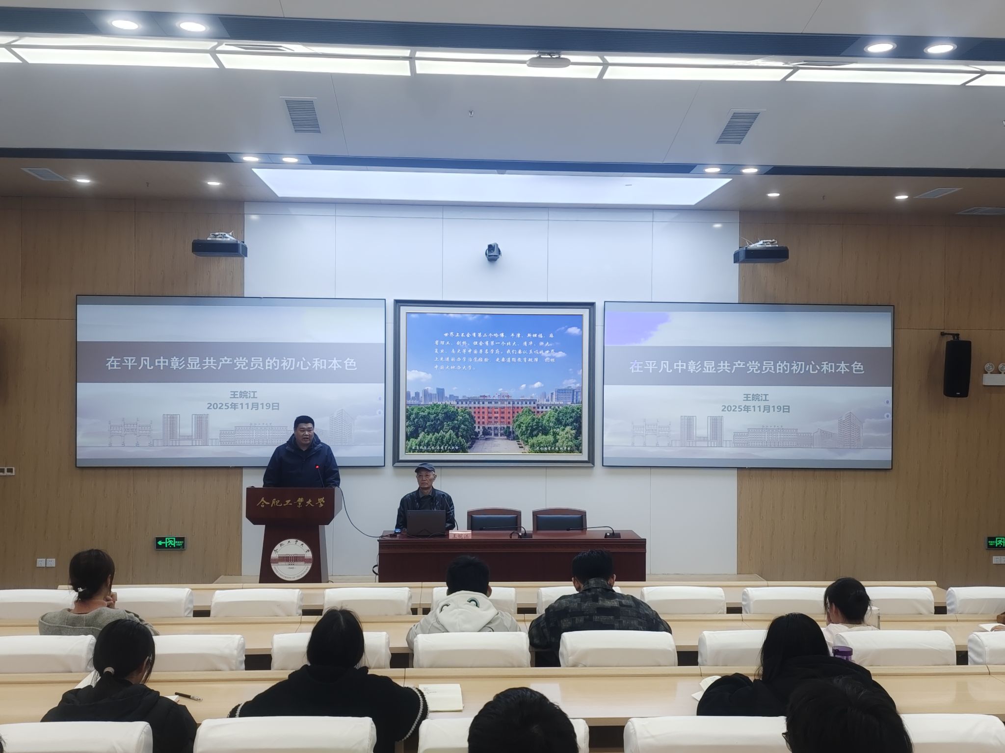 王皖江老师为学员们讲授党课“在平凡中彰显共产党员的初心和本色”。授课开始,王晥江老师便点明了党员身份的双重属性,他以我校优秀共产党员坚守科研教学一线的典型事迹为切入点,结合自身经历,从“坚定理想信念,经得起时间考验”、“不计个人得失,经得起利益考验”、“不怕艰难困苦,经得起困难考验”、“不惧潜在危险,经得起风险考验”四个方面,深情讲述老一辈工大人扎根教育、践行工业报国志向的奋斗历程,号召全体管理学子传承工业报国精神,鼓励同学们端正入党动机,不仅要通过奋斗争取入党,更要在入党后持续奋进,像老一辈共产党员一样,经受住各种考验,在平凡中彰显共产党员的初心和本色。