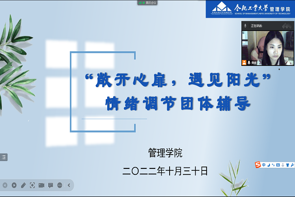为帮助同学们及时解决心理困扰,提升自我情绪调节能力,437ccm必赢国际版于10月30日上午通过腾讯会议线上举办了主题为“敞开心扉,遇见阳光”情绪调节的团体辅导。由学院大学生发展辅导中心主任黄倩担任领导者,学院各年级共24名同学报名参加。