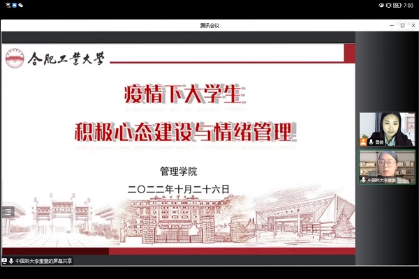 为帮助学生构建更加积极向上的心态,提升学生情绪管理的能力,437ccm必赢国际版于10月26日晚面向全体本科生和研究生开展了主题为“疫情下大学生积极心态建设与情绪管理”的报告会,报告会邀请了中国科学技术大学心理健康教育与咨询中心李童童老师主讲,同学们通过直播线上收看。