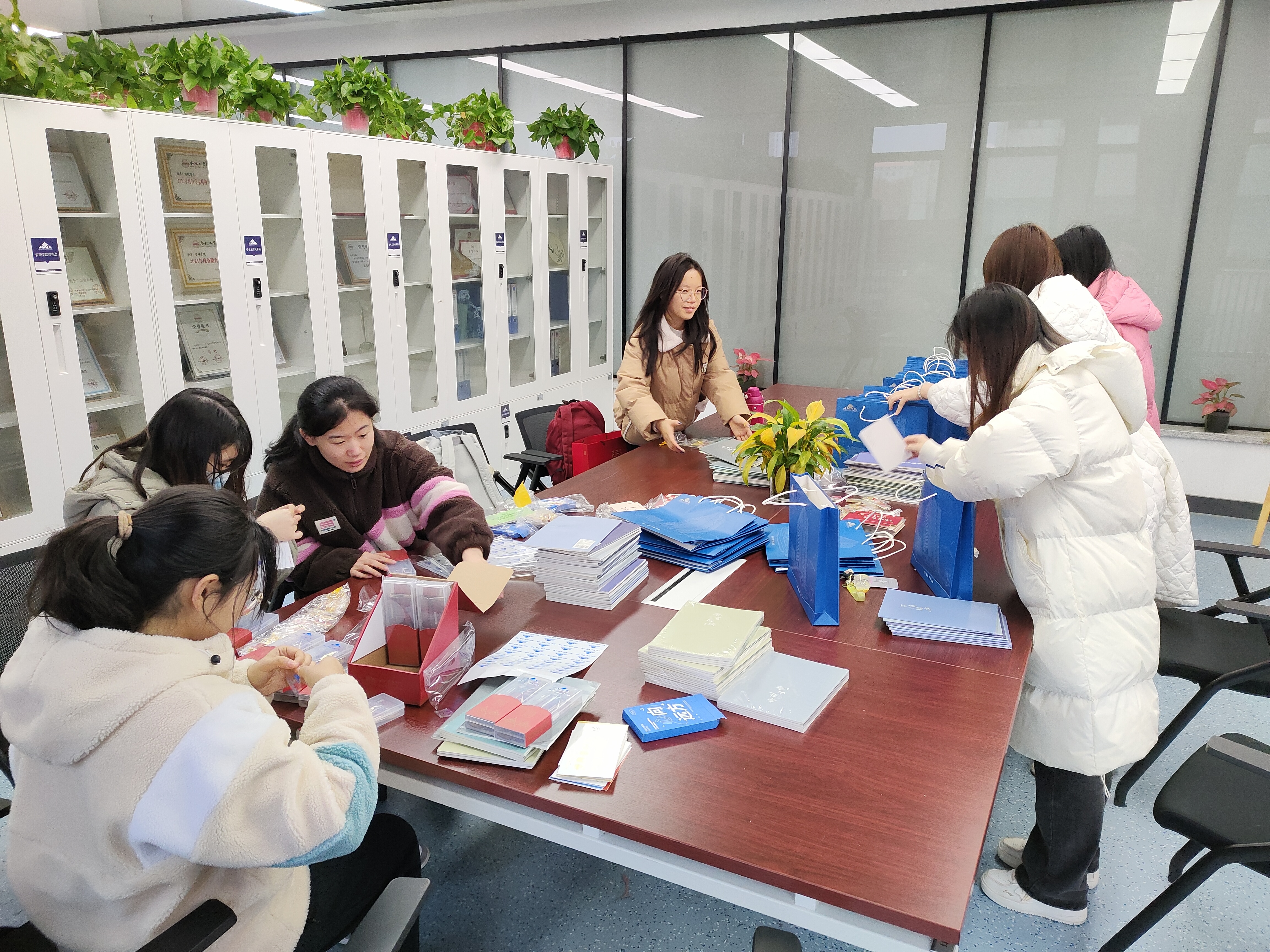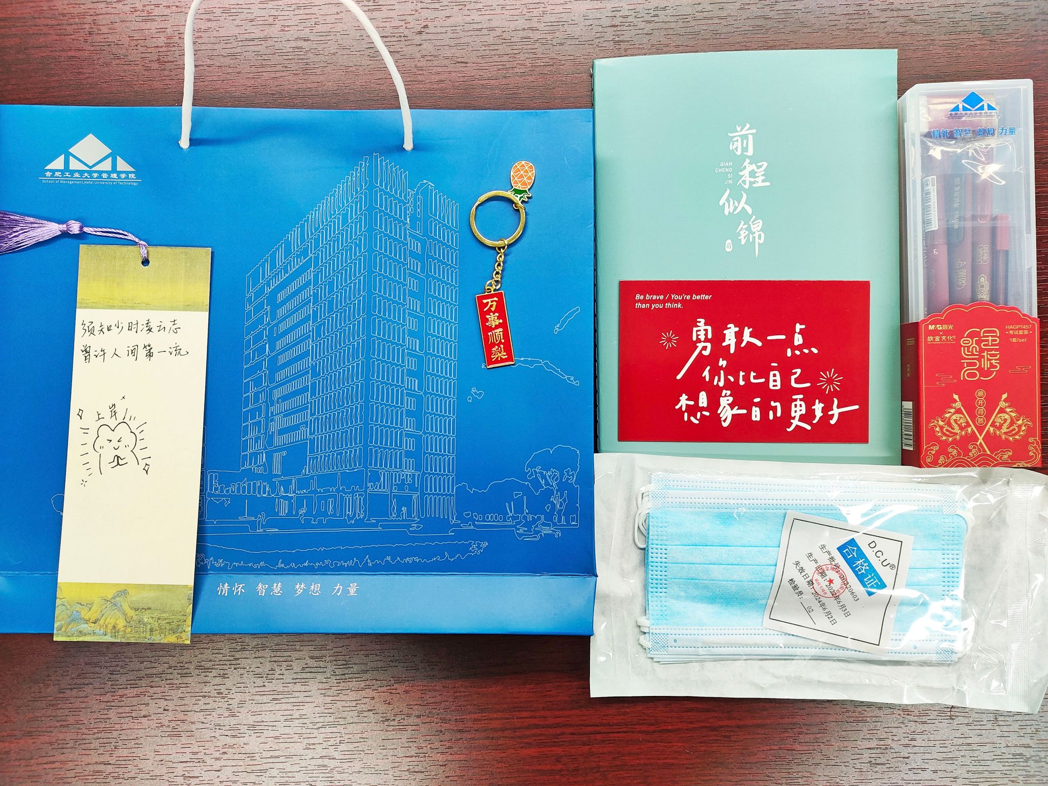 学院提前谋划布置,依托学生党支部组织各年级党员、发展对象、积极分子组成志愿队,将含有管院logo的文具套装、印有“前程似锦”、“顶峰相见”、“万事顺梨”等美好寓意的本子、明信片和钥匙扣,以及由低年级学生写给考研学生的书签等分装进182份“加油包”,然后带到宿舍亲自送到考研学子手上。学生们在收到礼包后十分感动,纷纷感谢学院和学弟学妹们的暖心鼓励和诚挚祝福。