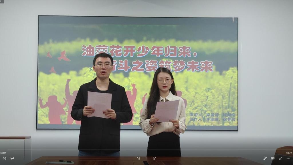 甘玉玲同学演讲主题为《观感家乡巨变,讴歌伟大祖国》,讲述在党中央坚持农业农村优先发展的暖心举措下,随着乡村振兴战略的不断深入和推进,农村发展日新月异,人民的生活条件也不断改善,一个皖南的小村庄成为农民幸福生活的美好家园。梁晨蕾、程新皓两位同学共同演讲《油菜花开少年归来,奋斗之姿筑梦未来》,讲述一个小村庄改头换面变化的背后汇聚了每一个普通人的奋斗与梦想,奋斗者用臂膀扛起如山的责任,开启“奋斗加速度”,他们乘风破浪、迎难而上、砥砺前行、埋头苦干,创造出来了一个又一个中国奇迹,汇聚斑斓长卷,坚守砥砺前行。