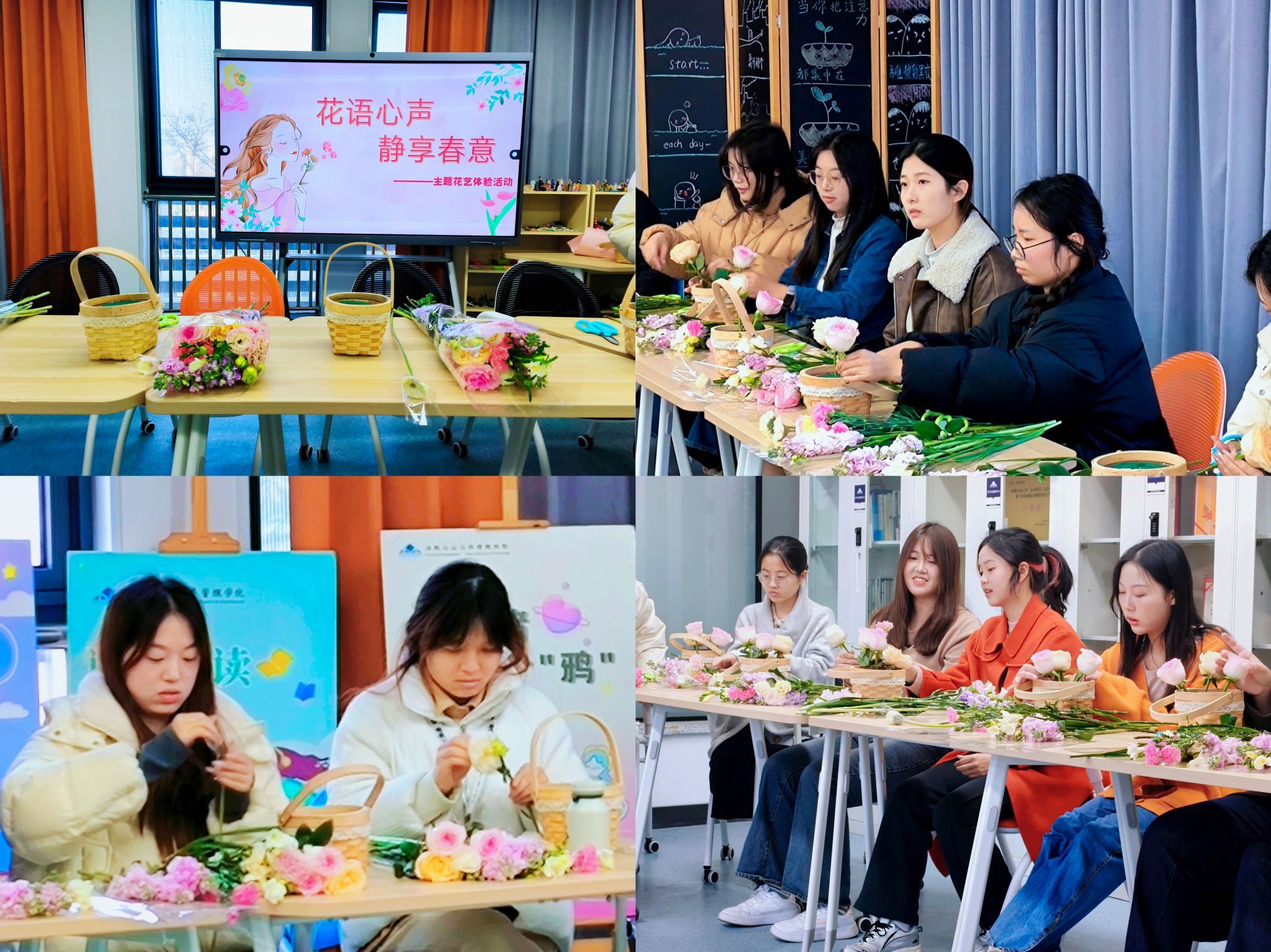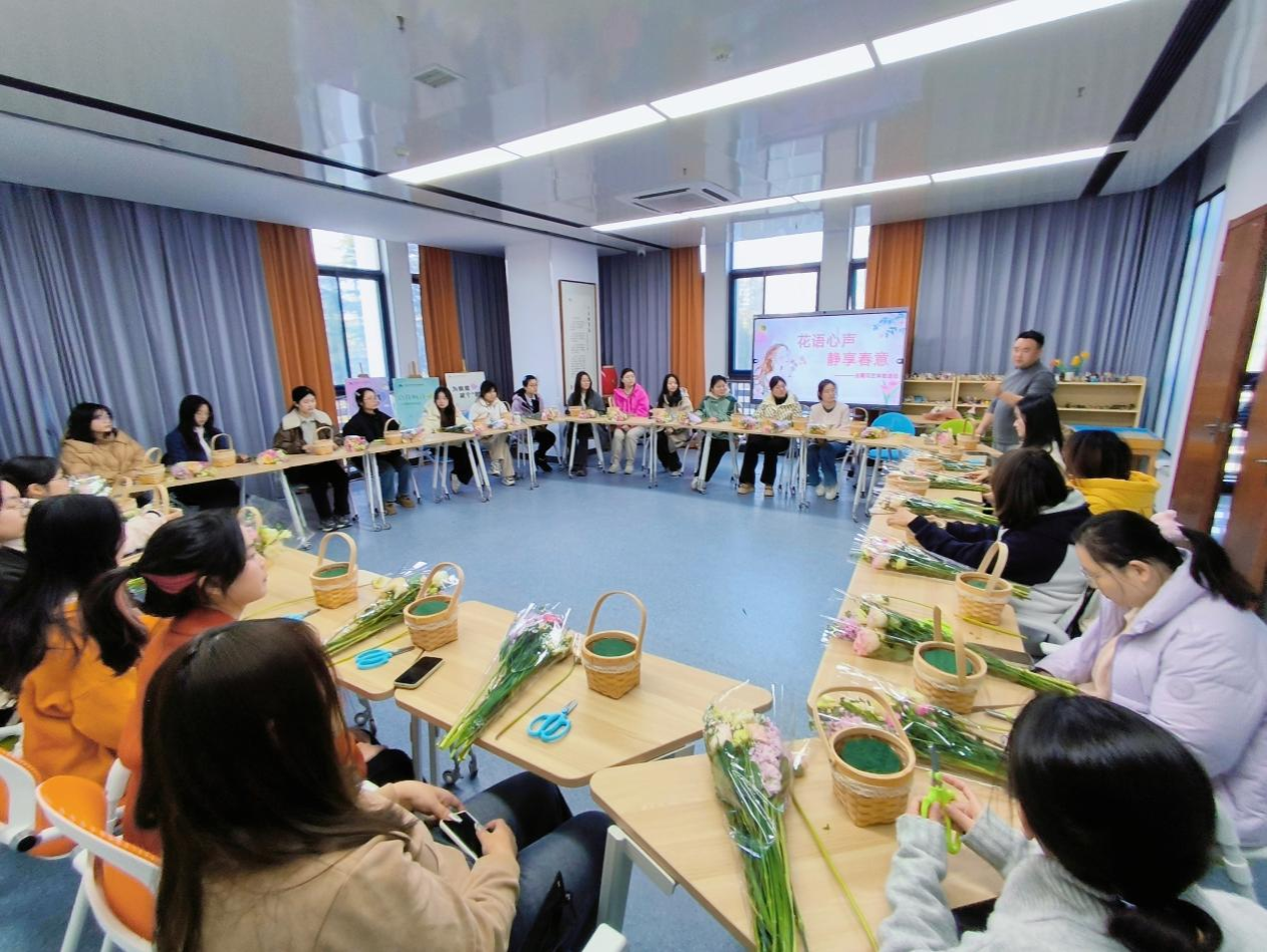 活动过程中,专业花艺师运用三主枝构图法,生动展示如何将普通花材转化为充满生命力的艺术品。活动现场洋溢着温馨氛围,学生们通过五感体验,沉浸式感受花艺的独特魅力,在花香中陶冶情趣,在春日里收获美好心情。