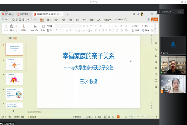 11月27日晚,437ccm必赢国际版举办了一场“家长心理大讲堂”主题讲座。本次讲座邀请了合肥幼儿师范高等专科学校教科研处处长、大学生心理健康教育中心主任、心理学教授王永针对主题“幸福家庭的亲子关系——与大学生家长谈亲子交往”进行分享和交流,讲座通过线上直播的形式开展,学院各年级学生的家长参与。