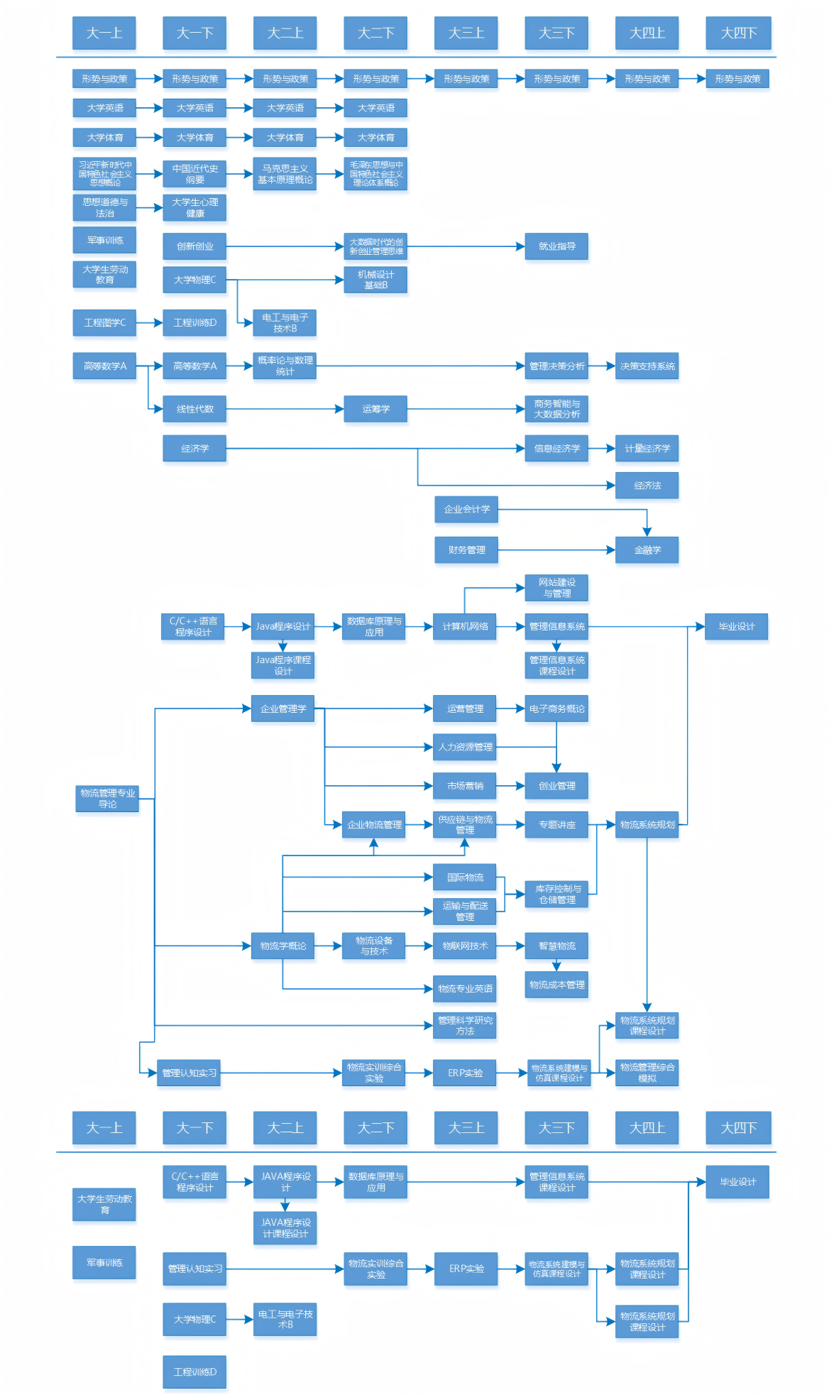 主干课程:物流管理专业导论、运筹学、企业管理学、经济学、经济法、企业会计学、电子商务概论、物流学概论、供应链与物流管理、物流系统规划、管理信息系统、物流技术与装备、企业物流管理、商务智能与大数据分析、数据库原理与应用、计算机网络、Java程序设计。