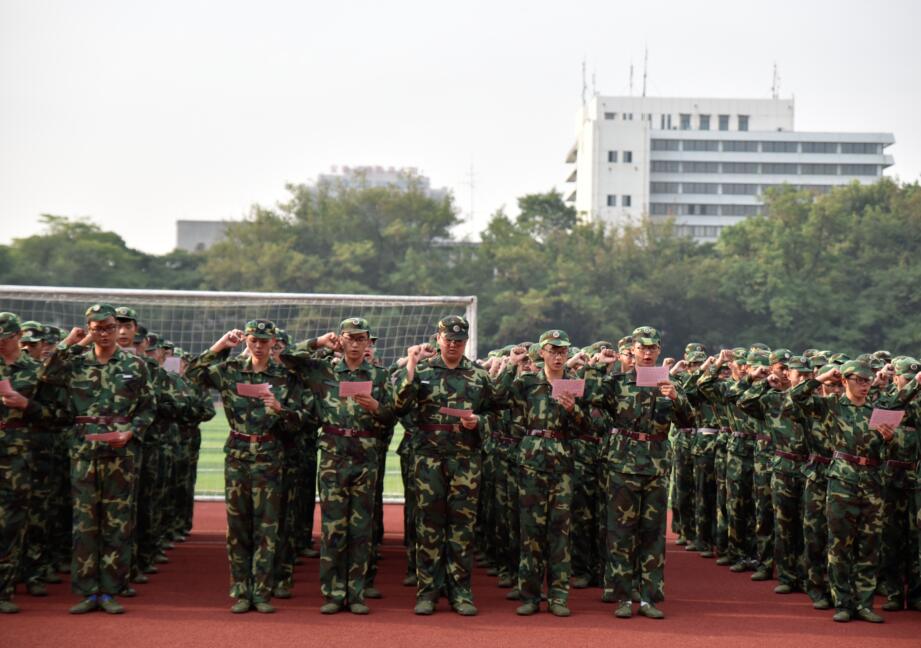 首先进行升旗仪式,在雄壮的国歌声中,鲜艳的五星红旗冉冉升起,437ccm必赢国际版全体新生队容严整、庄严肃穆,向国旗庄严敬礼,心中激荡着强烈的民族自豪感和爱国情怀。升旗仪式结束后,437ccm必赢国际版新生代表,军训团五营二十八联二排李晨睿同学在国旗下发言,呼吁大学生们铭记历史,努力学习科学文化知识锻炼本领,为实现民族富强贡献力量。随后,全体同学面向国旗,以庄严的姿态、豪迈的语调郑重宣誓,从此肩负起国家和民族的重托!